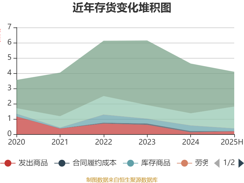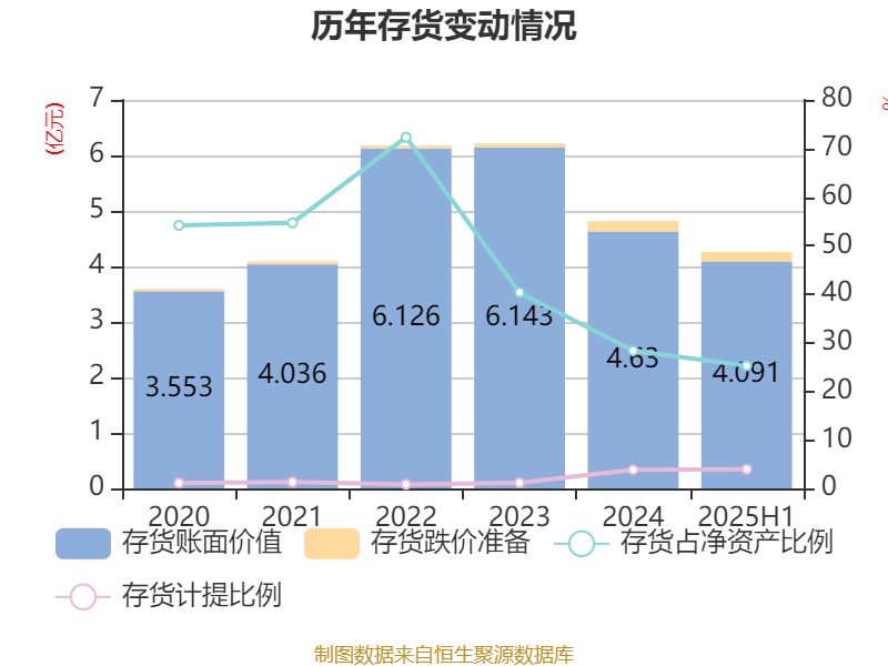 从存货变动来看,截至2025年上半年末,公司存货账面价值为4.09亿元,占净资产的25.25%,较上年末减少5386.3万元。其中,存货跌价准备为1678.35万元,计提比例为3.94%。