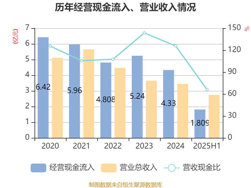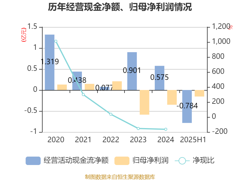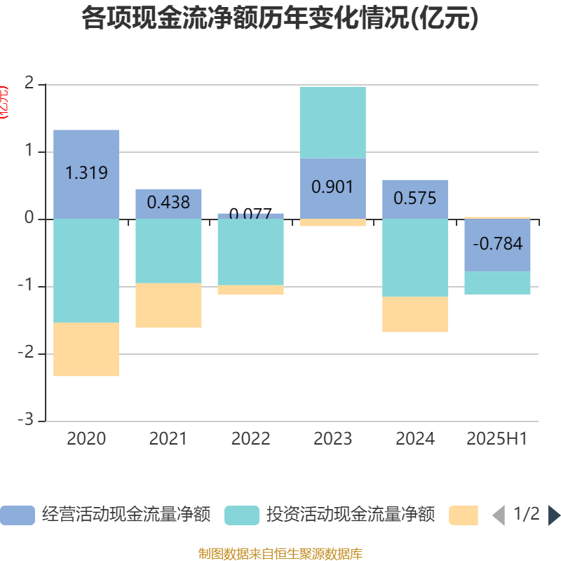2025年上半年V交易网,公司经营活动现金流净额为-7840.09万元,同比减少5895.56万元;筹资活动现金流净额258.82万元,同比增加4501.6万元;投资活动现金流净额-3412.78万元,上年同期为-1.02亿元。