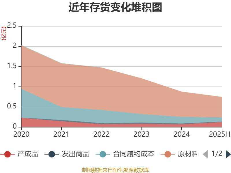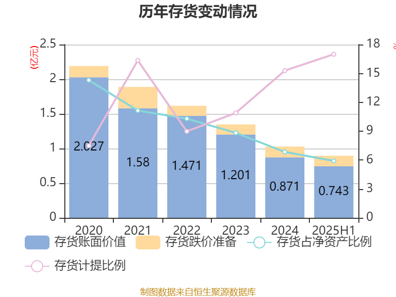 从存货变动来看,截至2025年上半年末,公司存货账面价值为7433.02万元,占净资产的5.91%,较上年末减少1278.44万元。其中,存货跌价准备为1520.95万元,计提比例为16.99%。